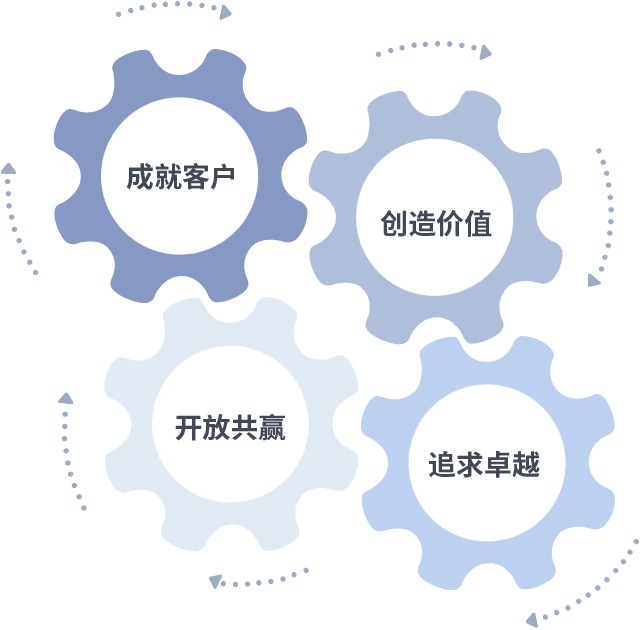 成就客户是一切决策的出发点,,,,创造价值是衡量所有工作的标准,,,追求卓越是我们做事做人的态度,,开放共赢是我们的格局也是最终的结果。。。价值观的齿轮环环相扣,,,推动着组织里的每个人不断向前。。